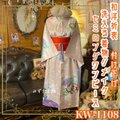 【着物リメイクワンピース セミロングドレス 洗える化繊 + 名古屋帯サッシュベルト 和洋折衷 レトロ 古着 ハンドメイド 薄桜×扇面取 四季花と花車 KW‑1108】