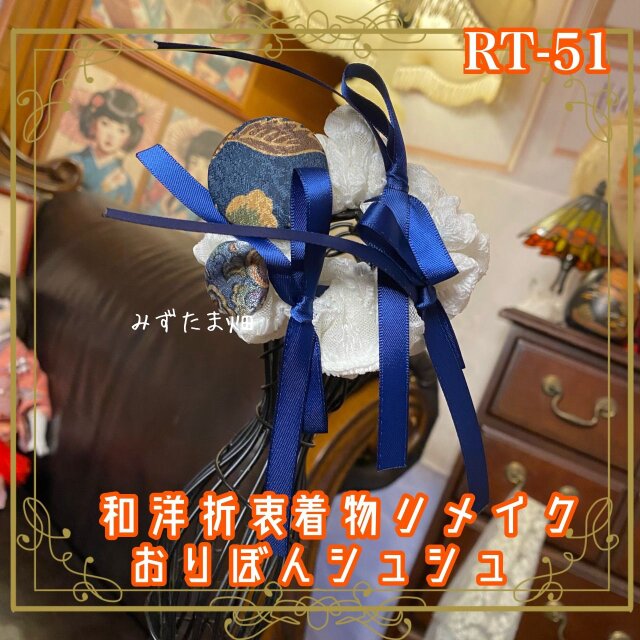 【着物リメイク シュシュ ハンドメイド おりぼん ヘアアクセサリー 和洋折衷 レトロ 和ロリータ 藍紺(ネイビー系) RT-51】