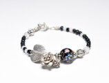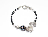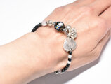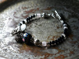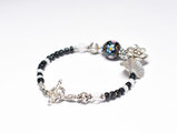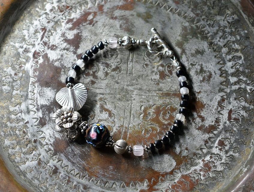 漆黒ヴェネチアアンティーク薔薇と勿忘草とカレンシルバー、グーズベリー、漆黒ビーズのブレス