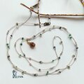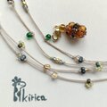 麻紐のようなカラーのコードに並べたのはゴールド、グリーン、そして濃淡のグレー。形もさまざまなビーズたちを、楽しいリズムに並べました。