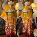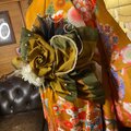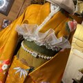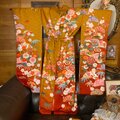 鮮やかな地色に金彩をきかせた古典花文(桜・菊・蘭など)が咲きこぼれる振袖地を贅沢に使用。裾へ向かって流れる草木のラインがスタイルをすらりと見せ、歩くたびドラマティックに揺れます。二部式帯はアイボリー×金の帯地にパールとチュールフリルを添え、背中に立体的に華やぎをプラス。パーティや撮影、舞台衣装にも映える和洋ミックスの“主役”セットです。