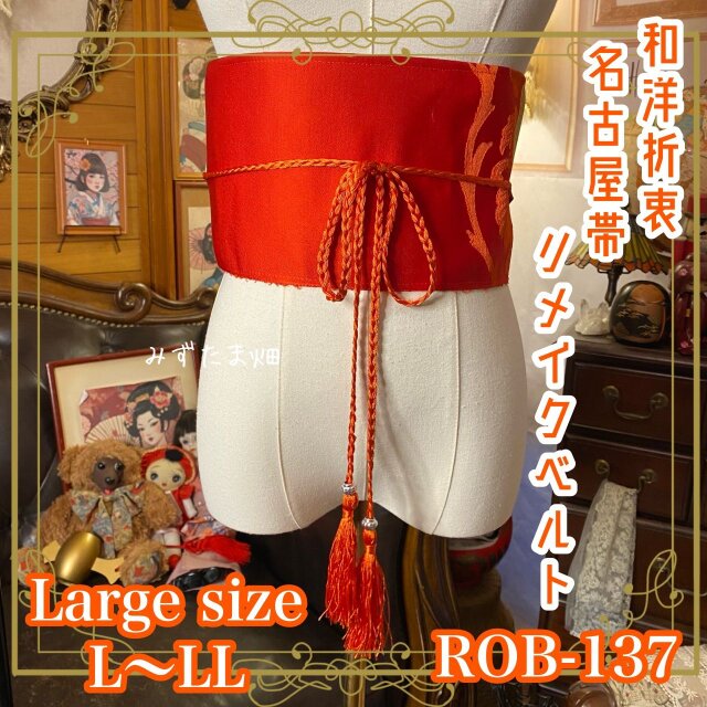 【名古屋帯 リメイク サッシュベルト 飾り帯 和洋折衷 ハンドメイド レトロ 古着 L〜LL対応 朱赤×金糸大花文 ROB-137】
