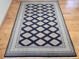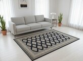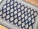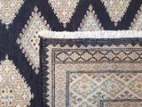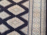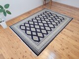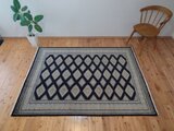 ブラックを基調とした美しいデザインの絨毯です。幾何学模様が規則正しく並べられており、落ち着いた雰囲気を感じます。