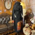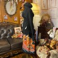 【 黒留袖 着物 リメイク ワンピース ロングドレス 和洋折衷 洗える 化繊 ハンドメイド レトロ 古着 扇面×梅×鶴が舞う、橙~朱 TKW-87】