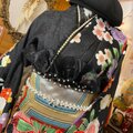 艶やかな黒地(小花の地紋入り)に、赤の疋田風パネルを効かせた絵羽柄。牡丹・菊・梅・桜などの四季花が色鮮やかに連なり、白い花びら散らしがリズミカルに舞う大正ロマンな一枚です。二部式帯はシルバー×多色段文の帯地に黒オーガンジーフリルとパールを添え、背中はゴールド×多色の大輪に咲いて360°華やかに。ベレーやブーツ合わせで、パーティや撮影、ステージにも映える和洋ミックスが完成します。