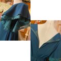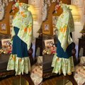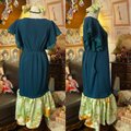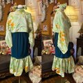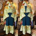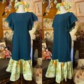 【 着物 ハンドメイド ワンピース パーティー ドレス 和洋折衷 コラージュ リメイク 切り替え ミント花柄×ピーコックブルー O-74】