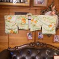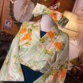 柔らかなミントグリーンに橙×白の花々が咲く着物生地をリメイク。光沢ある地紋がさざ波のようにきらめき、レトロ可憐なムードを纏います。ミント×深青×橙の配色が肌映えし、デイリー〜お呼ばれまで幅広く活躍。サステナブルな一点物のセットアップです。