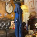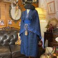 深い藍紺地に、縞取りで配した草花・流水・小花文を点描のような細かな柄で重ねた、シックな一着。セットの無地瑠璃色サッシュベルト(ゴールドタッセル紐付き)がコーデをきりっと引き締め、前結び・サイド結びで表情チェンジ。ブーツやベレー合わせの和洋ミックスから、きれいめお出かけスタイルまで活躍する、大人モードなセットです。