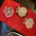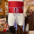 鮮やかな紅の名古屋帯をアップサイクル。光沢ある帯地に亀甲地紋、淡ピンク~ペールグリーンの梅花がふんわり浮かぶ上品レトロな一本です。 ラベンダーカラーの組紐タッセル(ビーズ付き)は長さ調整が簡単で、ワンピやシャツ、ニット、アウターの上からひと巻きで“和×フェミニン”に格上げする一点物です。