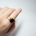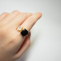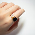 深みのある漆黒のスピネルは力強くシャープな印象を与え、オパールは角度によって虹色に揺らめき、指先に幻想的な彩りを添えます。