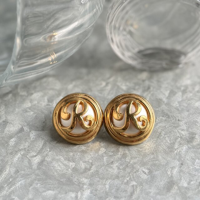 ゴールドトーンでイニシャル"R"をデザインされた、フェイクパールピアス。