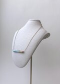 このネックレスは薄い水色とゴールドの2色を使い柔らかい印象の1点に仕上げました。優しい色使いなので、さりげなく付けたいという方におすすめです。