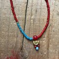 深紅のホワイトハートに落ち着きのあるくすみ色の水色の不揃いビーズを合わせました。古いアジアの少数民族に愛されたビーズです。