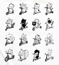 猫たちがチャリ(キックボード)でどこかに行きます。