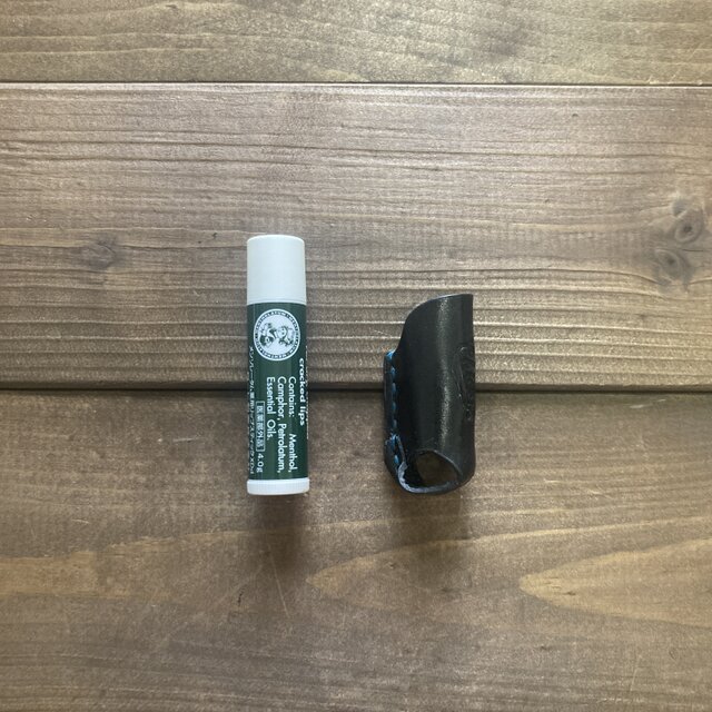 素材にロロマ(黒の蝋引き革)を使用しておりターコイズブルーの糸で仕上げたリップクリーム専用のスリーブタイプのカバー。(写真と同サイズのリップクリームに対応しています)