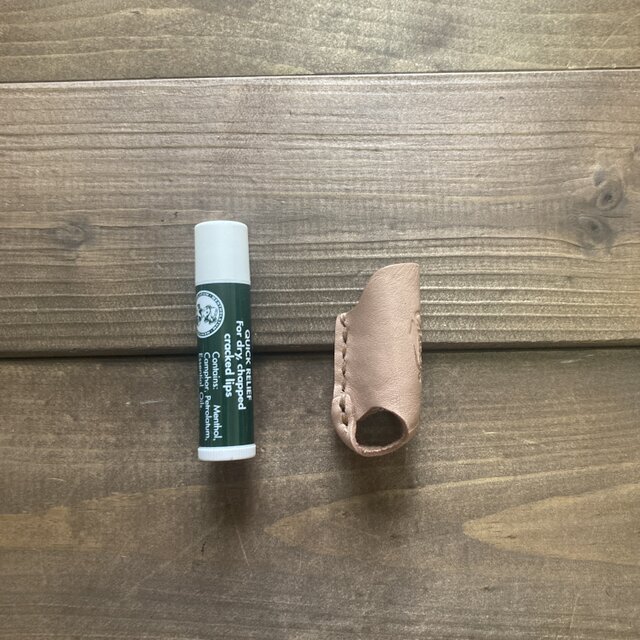 素材にはピンクベージュの牛革を使用しておりキャメルカラーの糸で仕上げたリップクリーム専用のスリーブタイプのカバー。(写真と同サイズのリップクリームに対応しています)