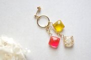 一つは赤く、一つはオレンジ色、そして三つ目にはお花と金箔を封じ込めたスクエアパーツを作り、リングパーツに吊るしました。