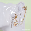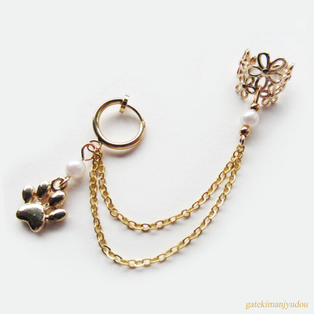 肉球とパール(プラ)のフープ型イヤリングとフラワーデザインのイヤーカフをパール(プラ)とチェーンで繋げました