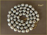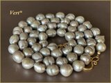 アイボリー~ベージュ系の色味を含んだ、シルバーがかった品の良いレアカラーの大粒縦長のバロックパールをひと粒ごとにベージュのグリフィンコードで結び留めたオールノット仕立てのロングネックレスです。100gを超す重量がございますので、重さが気になる方はご注意ください。