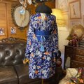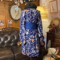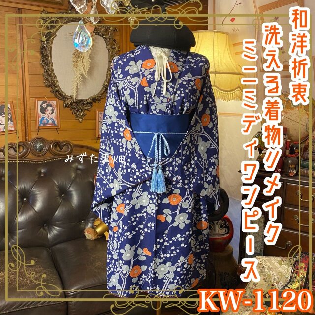 リメイク着物ワンピース ミニミディ 帯サッシュベルト付き 和洋折衷 化繊 洗える 藍紺×橙の花枝文 KW-1120