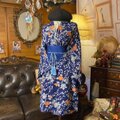 深い藍紺地に、灰銀の花葉と鹿の子風ドットが流れる“花枝文”。所々に咲く橙の花がぱっと映え、レトロで愛らしい表情です。裾からのぞく煉瓦色の裏地が歩くたびに上品。ウエストは帯ベルトでキリッとマークし、淡い水色の紐タッセルで印象的に。カラーは藍紺×灰銀×橙、アクセントにコバルトブルー&水色。和の趣とモダンさを一枚で楽しめる、街歩きやギャラリー巡りにもぴったりな着物リメイクワンピースセットです。