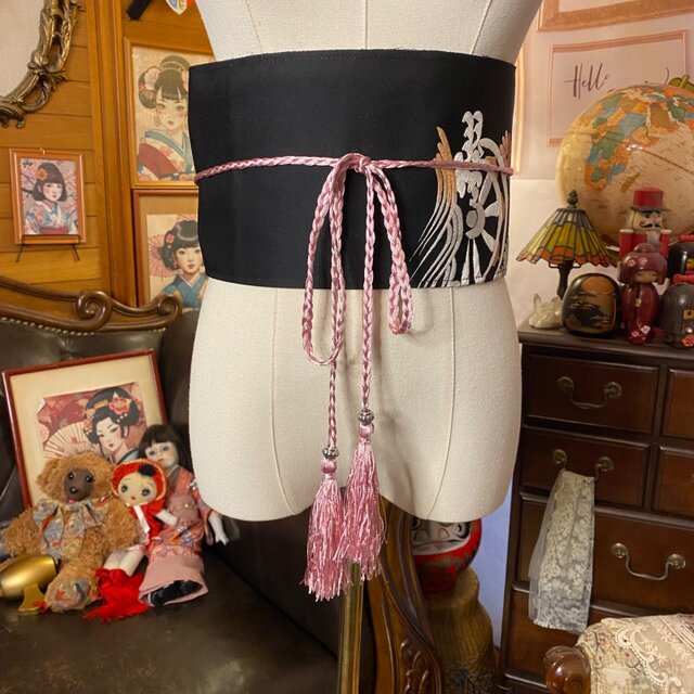しっとりとした黒地に、御所車と花々を金銀糸×やわらかなペールトーンで織り出した上品モダンなサッシュベルト。ワンピースやシャツ、ニット、着物の上からの和洋ミックスにも◎。クラシックな気品とほんのり甘さを両立した、一点もののウエストマークアイテムです。