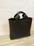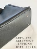 とても柔らかく軽いレザーですが、底敷と底鋲が付いているためしっかりと立ってくれます。底鋲、スタッズのカラーはシルバーです。それ以外にあえて金具は使わずに、スタッズが映えるようにできるだけシンプルなデザインしました。持ち手部分も同じ革で柔らかく、手が痛くならないと思います。