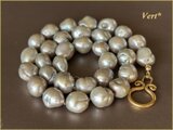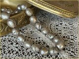 アイボリー~ベージュ系の色味を含んだ、シルバーがかった品の良いレアカラーの大粒縦長のバロックパールをひと粒ごとにベージュのグリフィンコードで結び留めたオールノット仕立てのショートネックレスです。