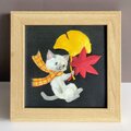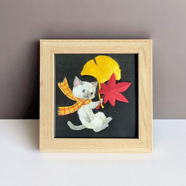 [複製画]和紙ちぎり絵アートプリント(無料ラッピング付き)『紅葉とネコ』秋を彩る小さな壁掛け