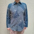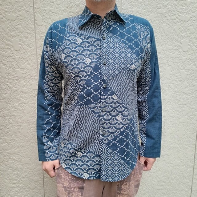 長袖むら糸藍染調シャツ(和文様パッチワーク)
