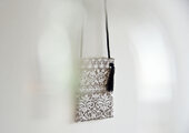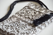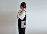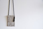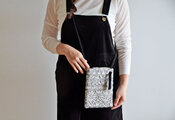 ベージュの生地にブラックチュールを重ねたヌーディーカラー。さらに繊細で華やかな刺繍がほどこされ、キラリと輝くシックでモードなスマホポーチです。