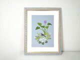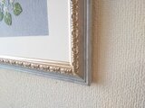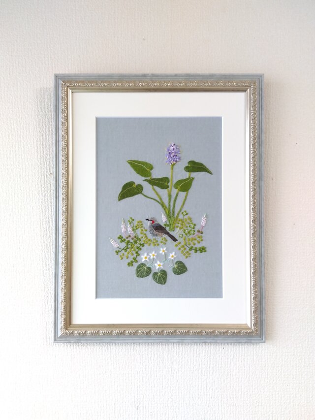 飾りのあるフレームに、ナチュラルなホワイトのマットで額装した手刺繍の作品です。