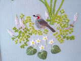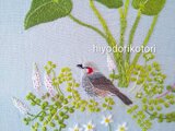 かわいいヒヨドリが昨日無事に届きました。刺繍は3Dなので写真より実物の方が10倍は素敵です!とても細かい刺繍で縁起の良い南天の実も赤々としていてうれしくなりました。大切に使わせていただきます。
