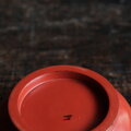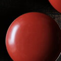 朱色寄りの赤に沈金技法での金の線描き状の芍薬の絵が美しい器です。