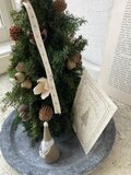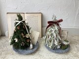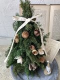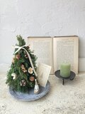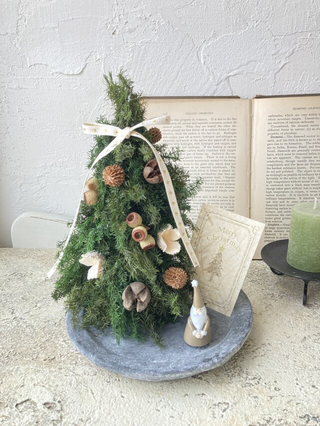 アンティークな雰囲気のロゼッタ皿に、プリザーブドフラワーのヒムロススギを使ったツリーに、木のみを飾り、サンタとクリスマスカードを添えて飾りました。