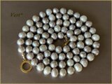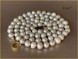 アイボリー~ベージュ系の色味を含んだ、品の良いレアカラーのポテトタイプのパールをひと粒ごとにベージュのグリフィンコードで結び留めたオールノット仕立てのロングネックレスです。