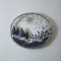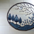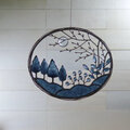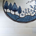 一見 濃藍の闇色ですが、光にかざすと 内側に入れたブルーが透けて、色のトーンの違いや リースの下の原っぱの部分に施した草花のレリーフ模様が楽しめます。