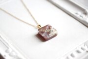 こっくりしたブラウンの背景にお花やパールを配置し、ラメと白いラインを置いたデザインが上品なペンダント。