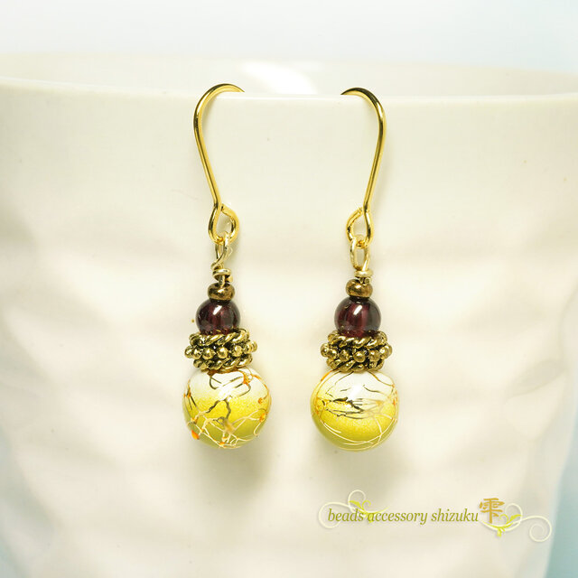 白からうぐいすへと移ろう美しいグラデーションに、金色の唐草模様が映える和の趣のピアスです。