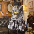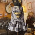 【 単衣 着物 ミニ丈 ワンピース ドレス 和ロリ 2部式作り帯 名古屋帯 お太鼓 リメイク 和洋折衷 洗える 化繊 ハンドメイド レトロ 古着 スモーキーグレーの霞×流水×花丸 MKW-38 】