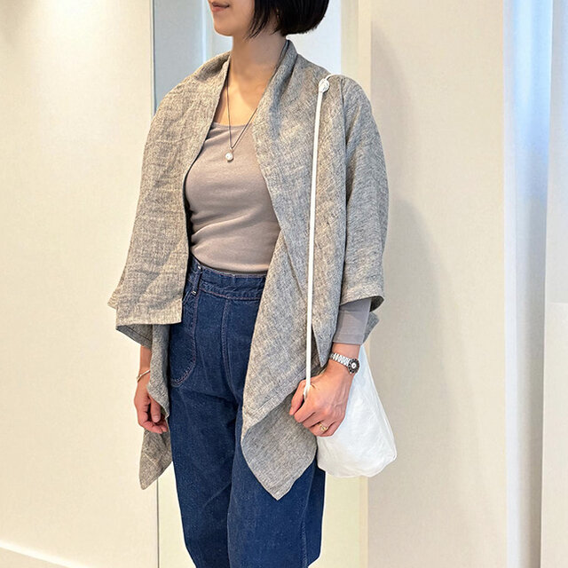 前を留めるボタン等は付いていないので、肌寒い時にさっと羽織るのにぴったり。