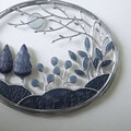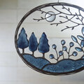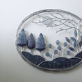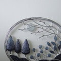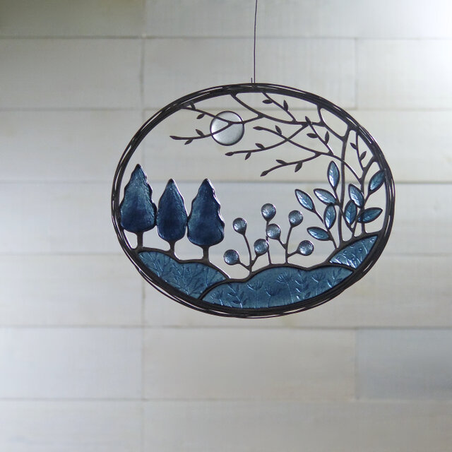 一見 濃藍の闇色ですが、光にかざすと 内側に入れたブルーが透けて、色のトーンの違いや リースの下の原っぱの部分に施した草花のレリーフ模様が楽しめます。
