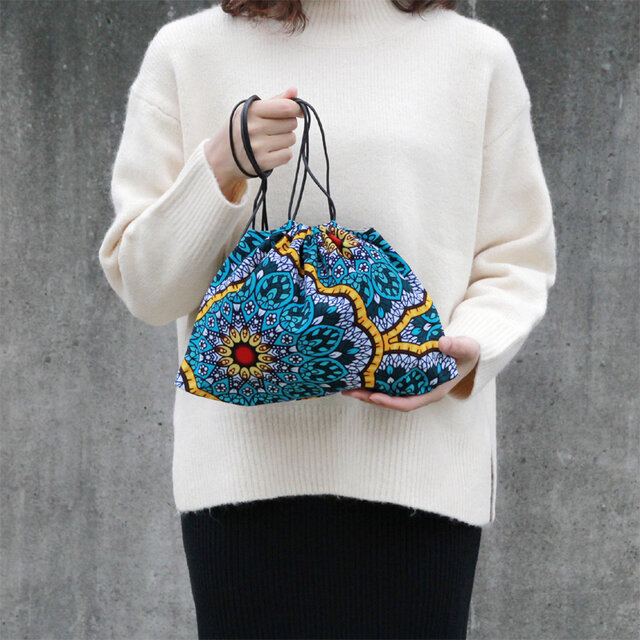 コンパクトで華やか、アフリカンプリントの巾着ショルダーバッグです。