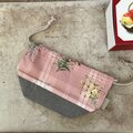 少しづつ大切にしまっておいた小さなハギレをパッチワークして作った巾着袋。最後まで大切に生地を使いたかったので、このサイズの巾着袋になりました。