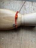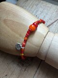 トップにはこのブレスの中で大きいビーズを選び(柑橘色と赤)あとはランダムに、単色のものや、スジ玉、セミクリアも少し入れています。