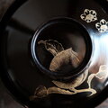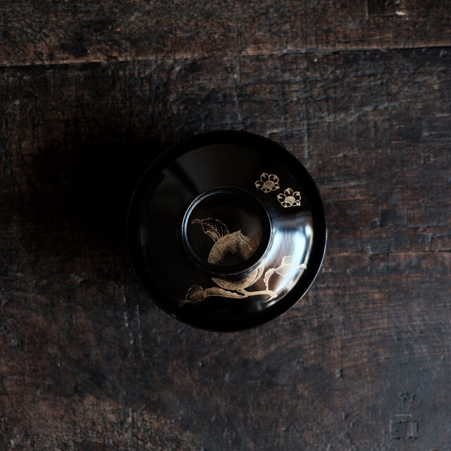 細かな線描き状の彫刻の絵付けに金彩が施された沈金技法での絵付けが素敵な器です。