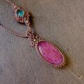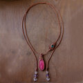 艶やかで深みのある濃いローズカラーがインパクトのある美しいインド産ロードナイトをメインに、首紐部分には透明感があり鮮やかなエメラルドグリーンが魅力的なコロンビア産エメラルドを合わせた印象的なマクラメ編みペンダントネックレスです。