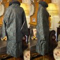 深い墨黒〜青鈍(あおにび)を基調に、六角の亀甲文に唐花を配したレトロモダンな総柄。所々に錆朱・藍・灰青が差し色で灯り、しっとり艶のあるヴィンテージ着物地の表情を活かしました。ベレーやブーツ、帯風ベルトの重ねにも相性抜群で、和装・洋装どちらにも映える上品なアンサンブルです。特別な日から日常のレトロコーデまで、気取らず格上げしてくれる一点。