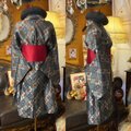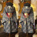 落ち着いた墨鼠〜チャコールを基調に、市松や麻の葉、小紋をモザイク調に配した総柄。ところどころに錆朱の花が咲き、レトロな艶感と温かみのある差し色が映えます。深紅×金の帯ベルトとゴールドタッセル紐でウエストマークすれば、式典や撮影にも映えるモダン和洋ミックスに。ベレーやブーツとも相性抜群—日常のレトロコーデから特別な一日まで品よく格上げしてくれる一着です