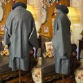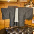 しっとりとした青墨〜チャコールを基調に、点描で織り出した微細な花菱・亀甲調の幾何柄。黒の小物や深藍のコード、帯ベルトとの相性も抜群で、日常のレトロコーデから撮影まで凛とした印象に仕上げてくれる上質な和洋ミックスの一着です。